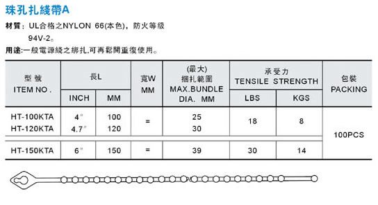 尼龍扎帶故名思意就是用尼龍材料制作的捆扎東西的帶子,設計有止退功能(活扣、珠孔除外)越拉越緊,也有可以拆卸的扎線帶(活扣、珠孔)。材料:尼龍扎帶采用UL(尼龍PA66)材料注塑制成,防火等級94V-2,具有耐酸、耐腐、絕緣不易老化、承受力極強。操作溫度-40℃到+85℃。尼龍扎帶由于產品的特殊性(薄壁、產品注塑流程比較大),其模具、注塑工藝和材料都相當講究、一般新的廠家都需要很長的摸索過程才能生產出合格的產品。