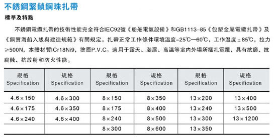 產品材質:不繡鋼扎帶采用UL認可尼龍66(Nylon 66)材料注塑制成,防火等級94V-2,具有良好的耐酸、腐蝕、絕緣性,不易老化、承受力強。操作溫度為-20℃到+80℃(普通尼龍66)。